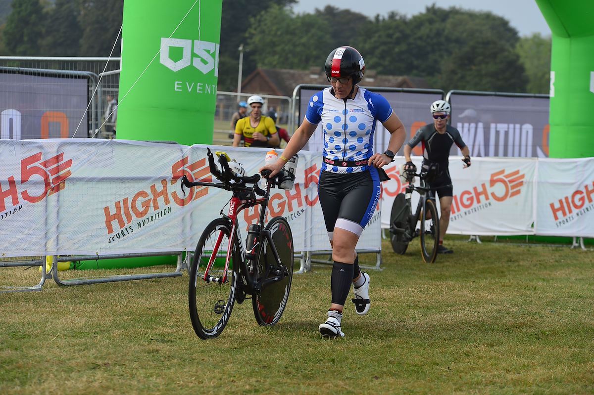 There were a few spots on the bike with a few supporters but otherwise it was a relatively quiet bike ride. There were enough other competitors around me not to make it feel lonely and it’s mostly flat. There’s one notable hill but lots of twists and turns. So, despite the fact it’s relatively flat I didn’t find it super-fast and struggled on some of the lanes to get my time trial bike to move! Or perhaps that was just my legs! The roads are not closed but there is traffic management in place with marshals giving priority to cyclists at a lot of junctions. However, there were some sections on busy open roads, with multiple traffic islands and a queue of traffic in front of me and a behind me. And there were a few places where it felt particularly dangerous so always remember you have to follow the highway code even in a race and remember to check your race ego in at the traffic jam.